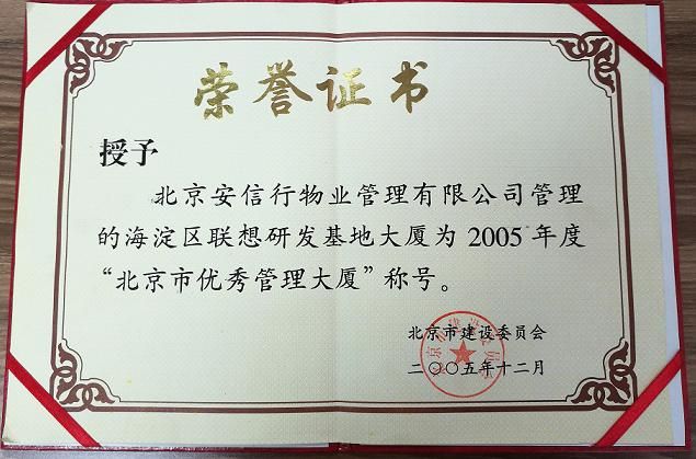 2005年度公司管理的聯(lián)想集團(tuán)辦公園區(qū)項(xiàng)目獲得了“北京市優(yōu)秀管理大廈”的榮譽(yù)稱(chēng)號(hào)。