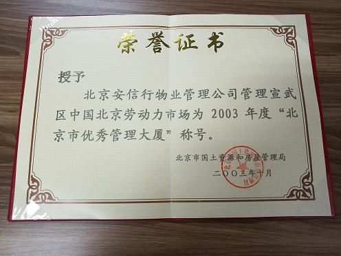 2003年10月,公司管理的項(xiàng)目中,北京市勞動(dòng)局辦公大樓獲得了“北京市優(yōu)秀管理大廈”的榮譽(yù)稱號(hào)。