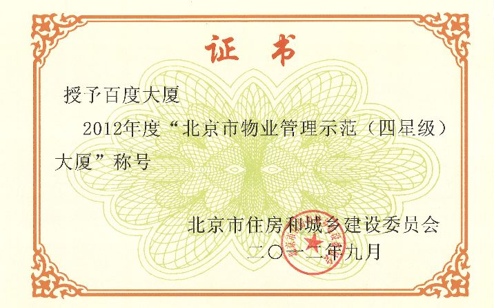 11月17日,經(jīng)過專家現(xiàn)場審核和住建委網(wǎng)上公示,百度大廈被評定為2012年度“北京市四星級物業(yè)管理示范項目”。